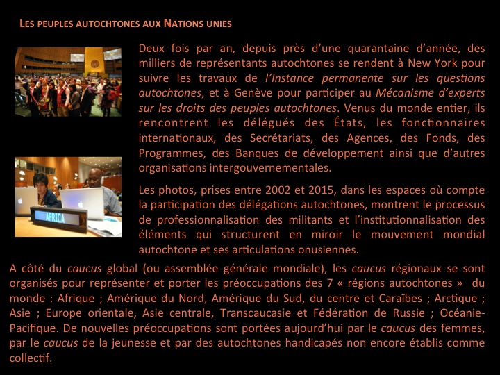 Intégrés dans la constellation onusienne, les délégations autochtones discutent avec ces autorités qu’ils ne rencontrent guère sur place, et avec les Agences, les Fonds ou les Programmes comme avec les banques ou les institutions intergouvernementales qui financent les projets de développement contre lesquels ils sont bien souvent en lutte.